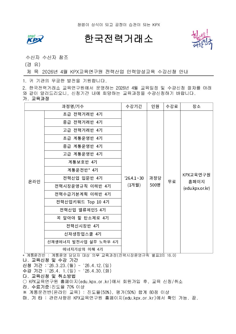 2026년 4월 KPX교육연구원 전력산업 인력양성교육 수강신청 안내