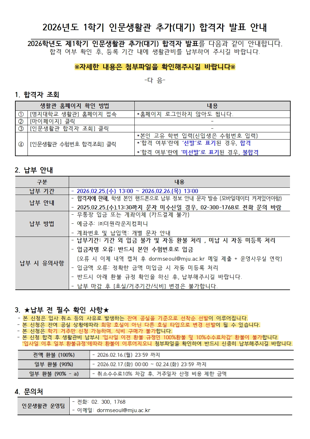 [자연] 2026년도 1학기 자연생활관 추가(입사대기) 납부 확인 안내