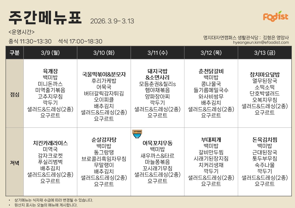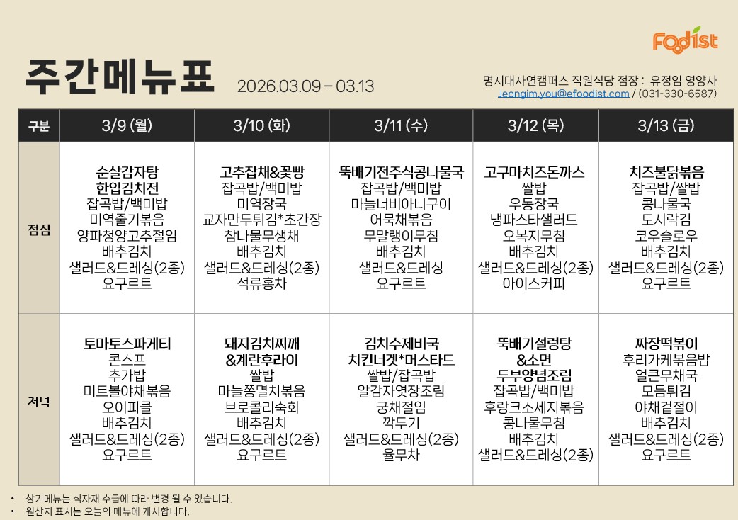 [자연] 2026년 3월 9일 ~ 3월 13일 식단표 (생활관, 방목관)
