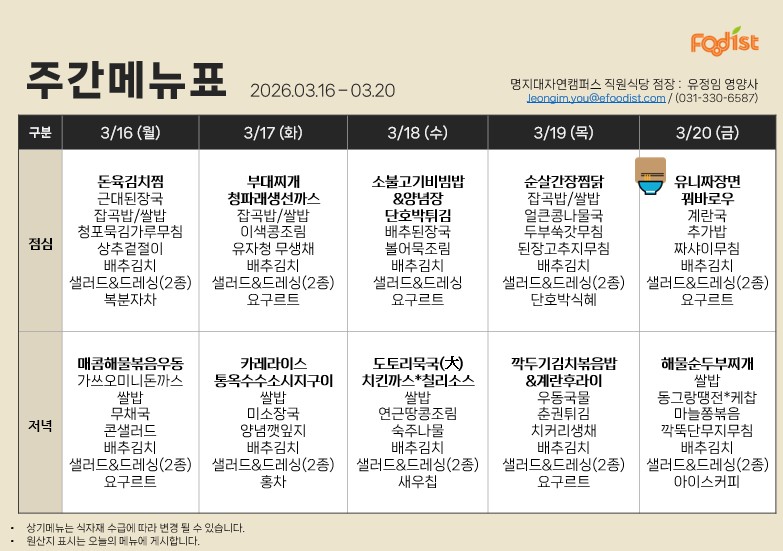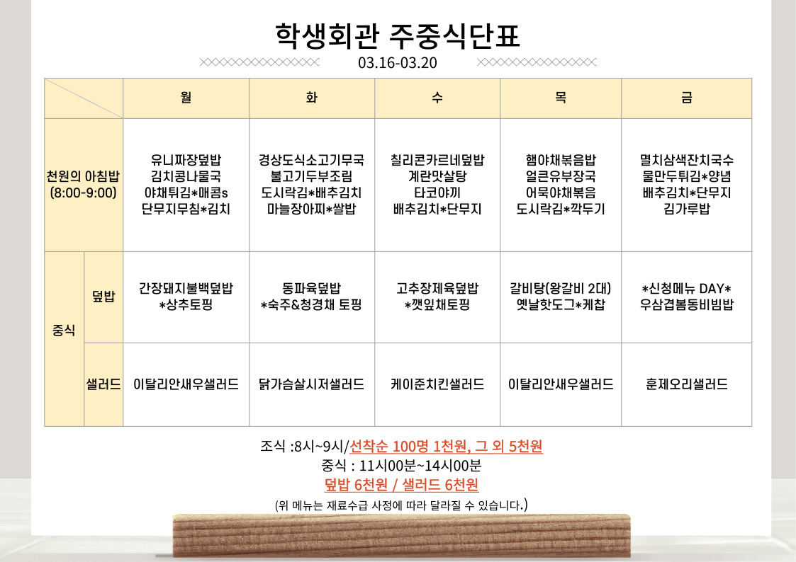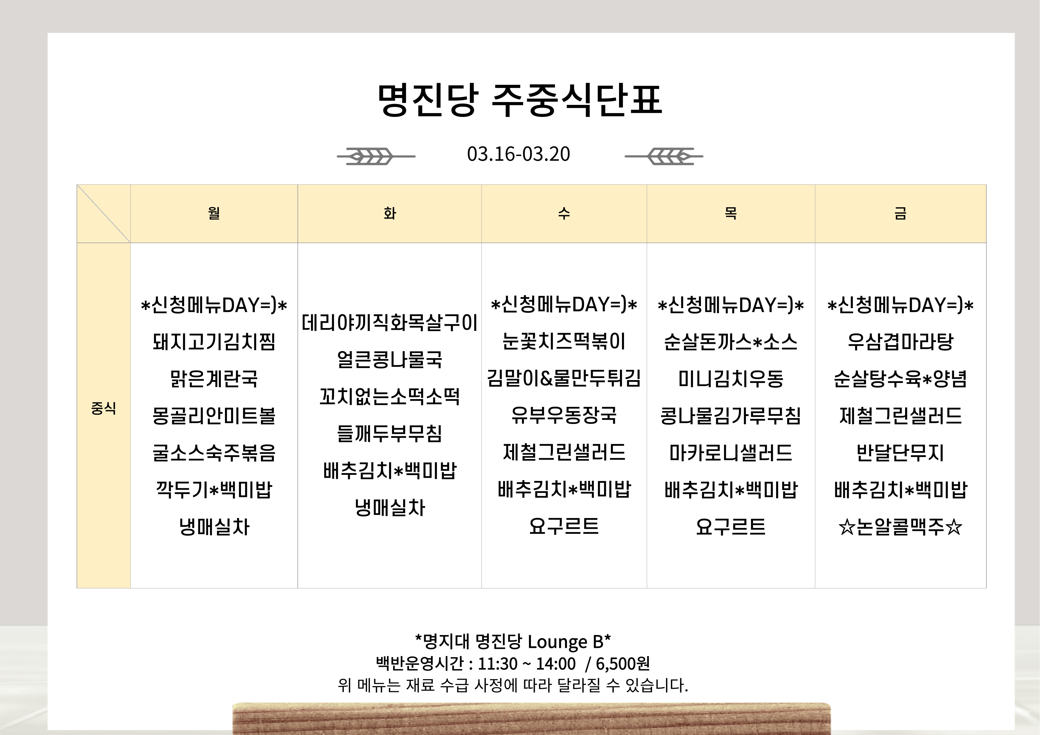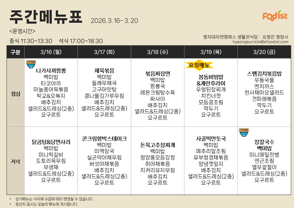[자연] 2026년 3월 16일 ~ 3월 20일 식단표 (생활관, 방목관, 명진당, 학생회관)