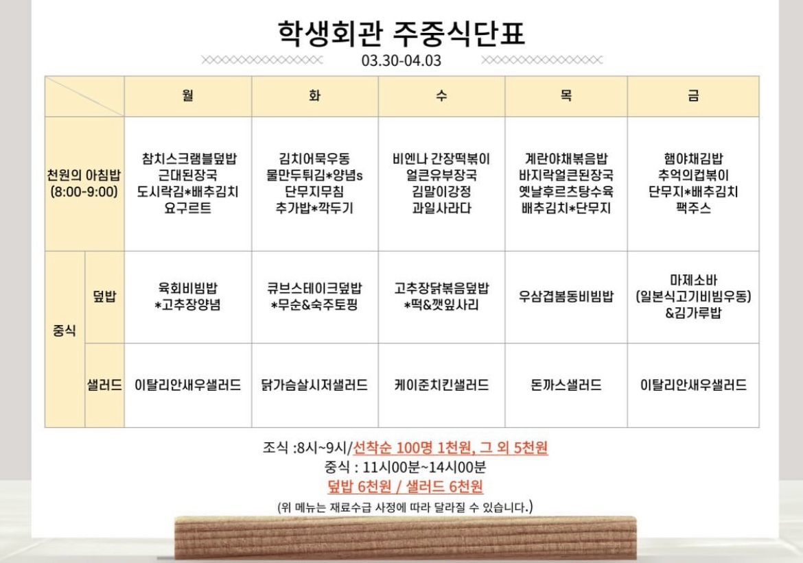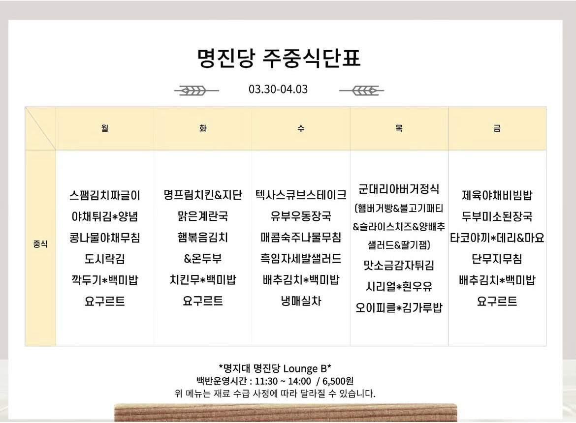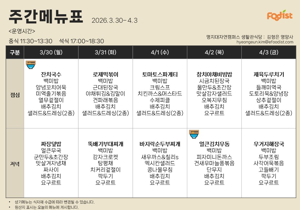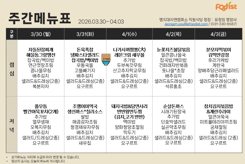 [자연] 2026년 3월 30일 ~ 4월 03일 식단표 (생활관, 방목관, 학생회관, 명진당)