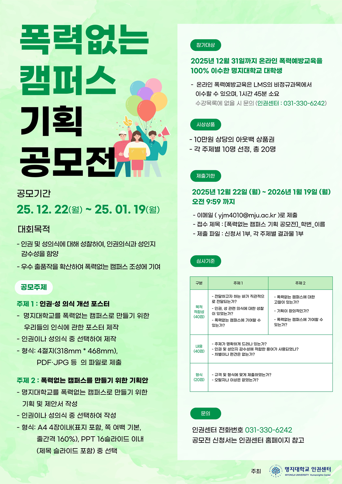 - 명지대학교를 폭력없는 캠퍼스로 만들기 위한 우리들의 인식에 관한 포스터 제작 - 인권이나 성의식 중 선택하여 제작 - 형식: 4절지(318mm * 468mm), PDF·JPG 등의 파일로 제출 |
