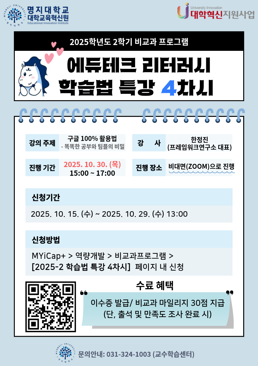 4. 2025-2 학습법 특강(4차) 신청기간: 2025.10.15.(수) ~ 2025.10.29.(수) 13:00까지