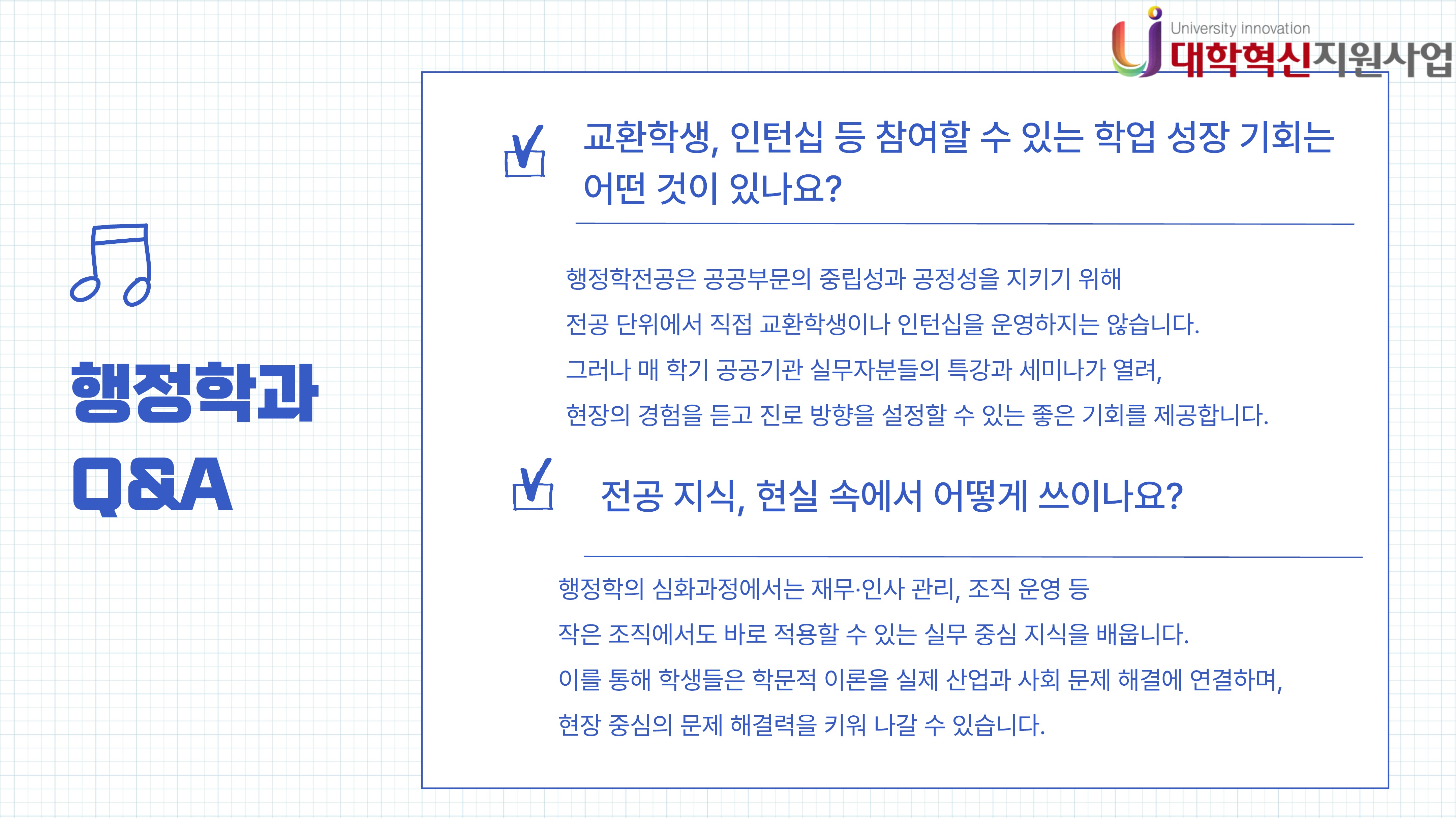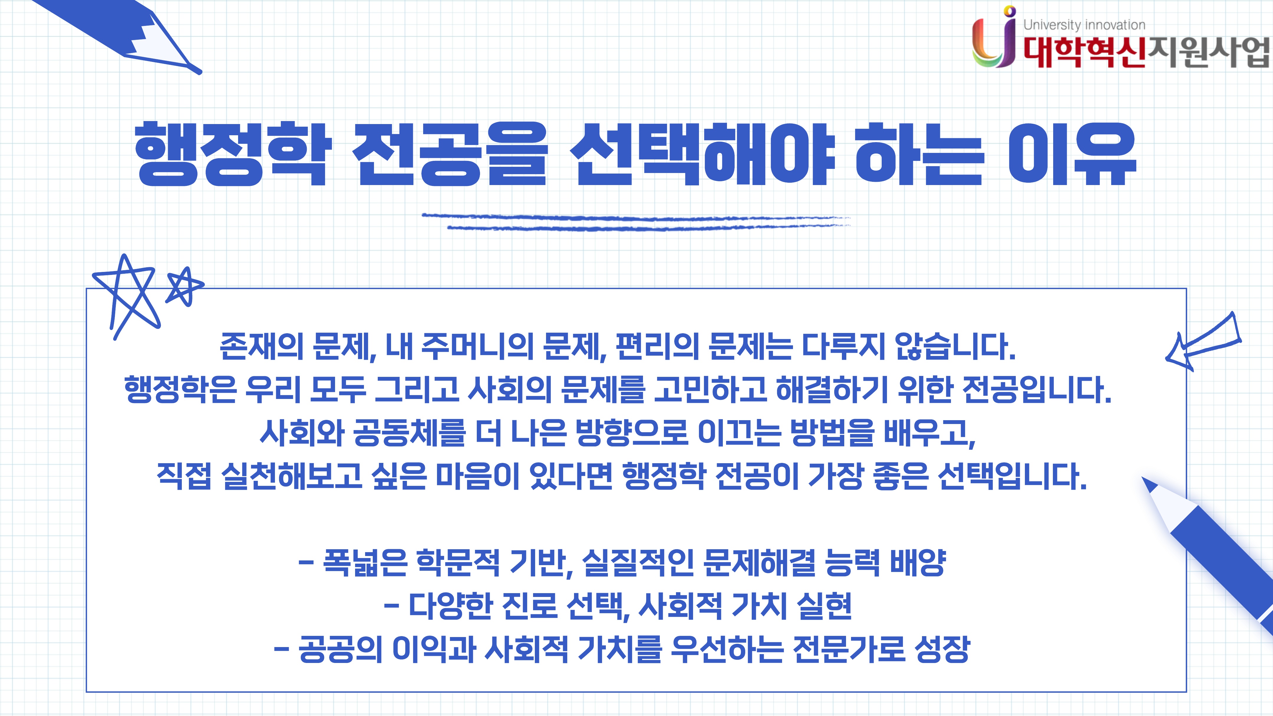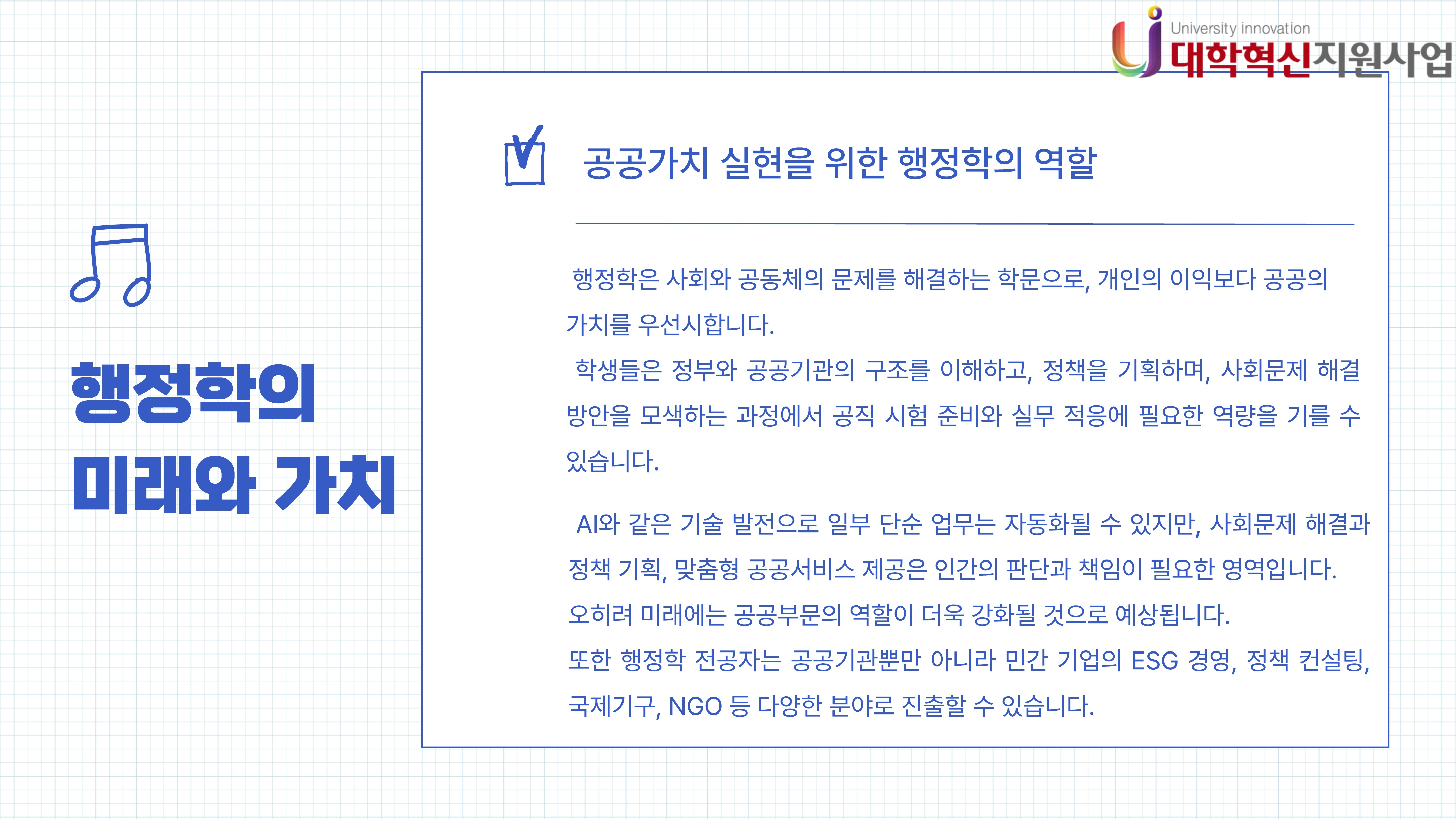 행정학은 공공의 가치를 실현하며 사회문제를 해결하는 학문입니다.
