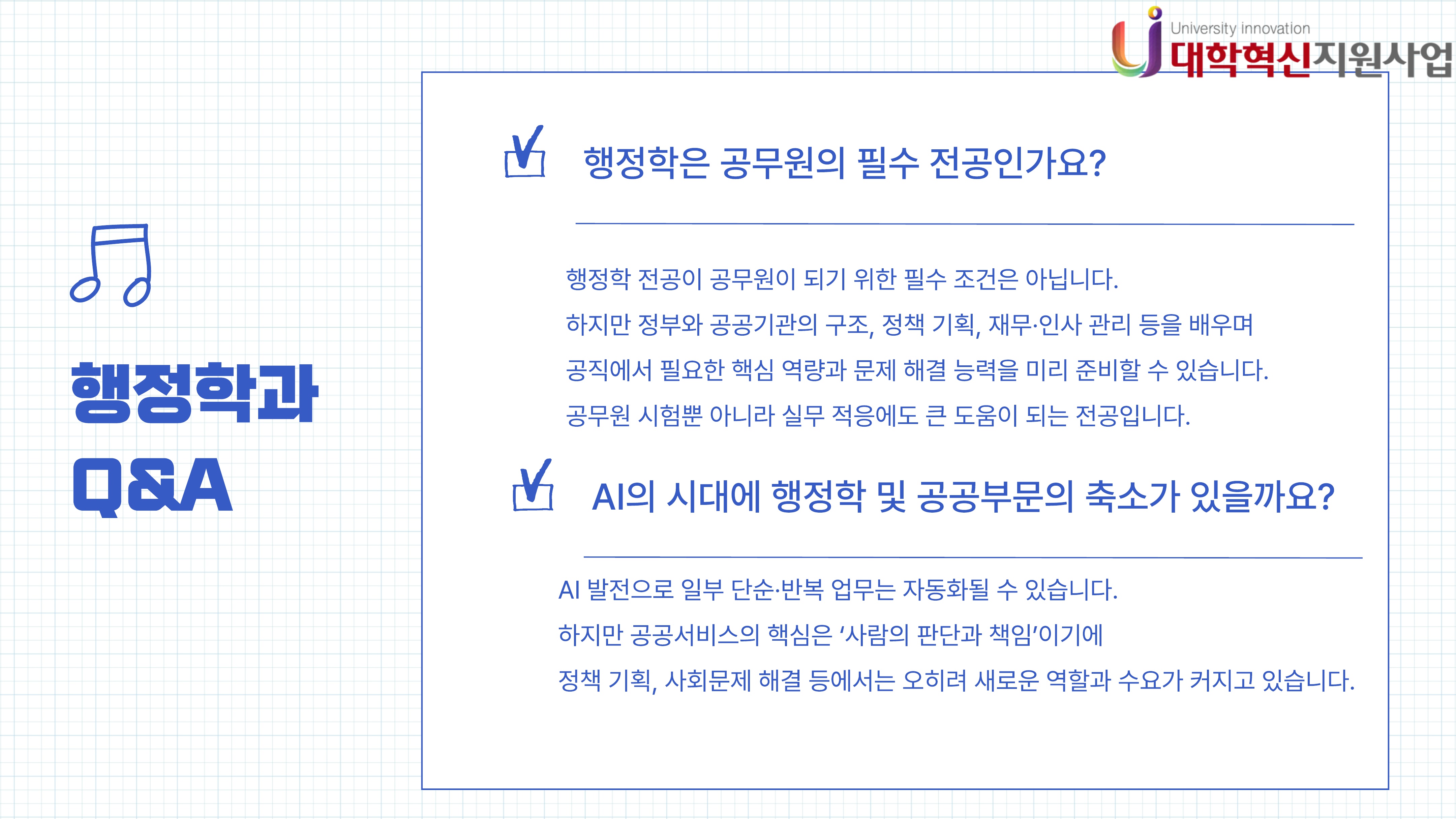 행정학은 공무원의 필수 전공은 아니지만 공직에서 필요한 능력을 미리 준비할 수 있습니다.