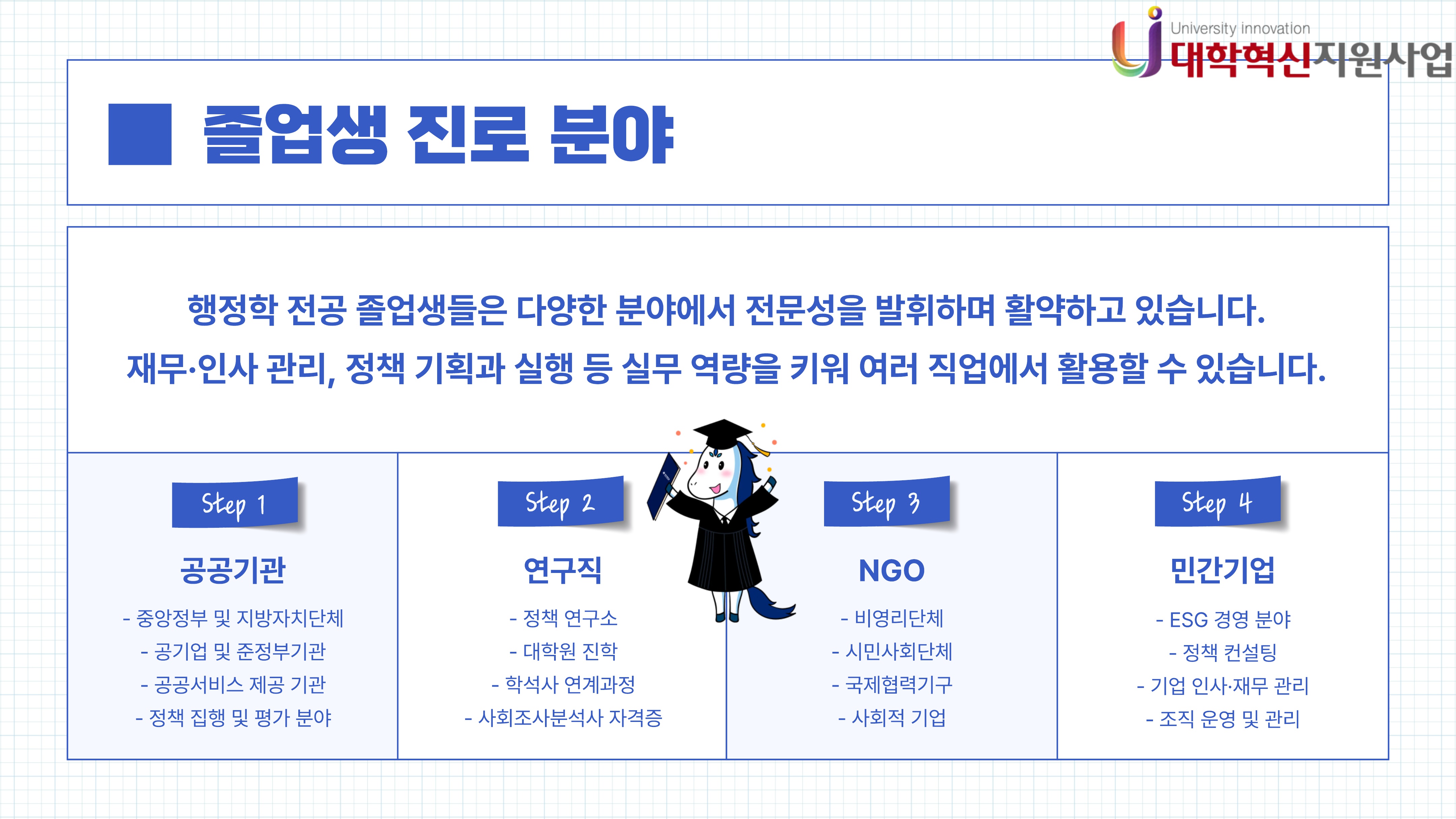 공공기관, 연구직, NGO, 민간기업 등 폭넓은 진로 선택이 가능합니다.