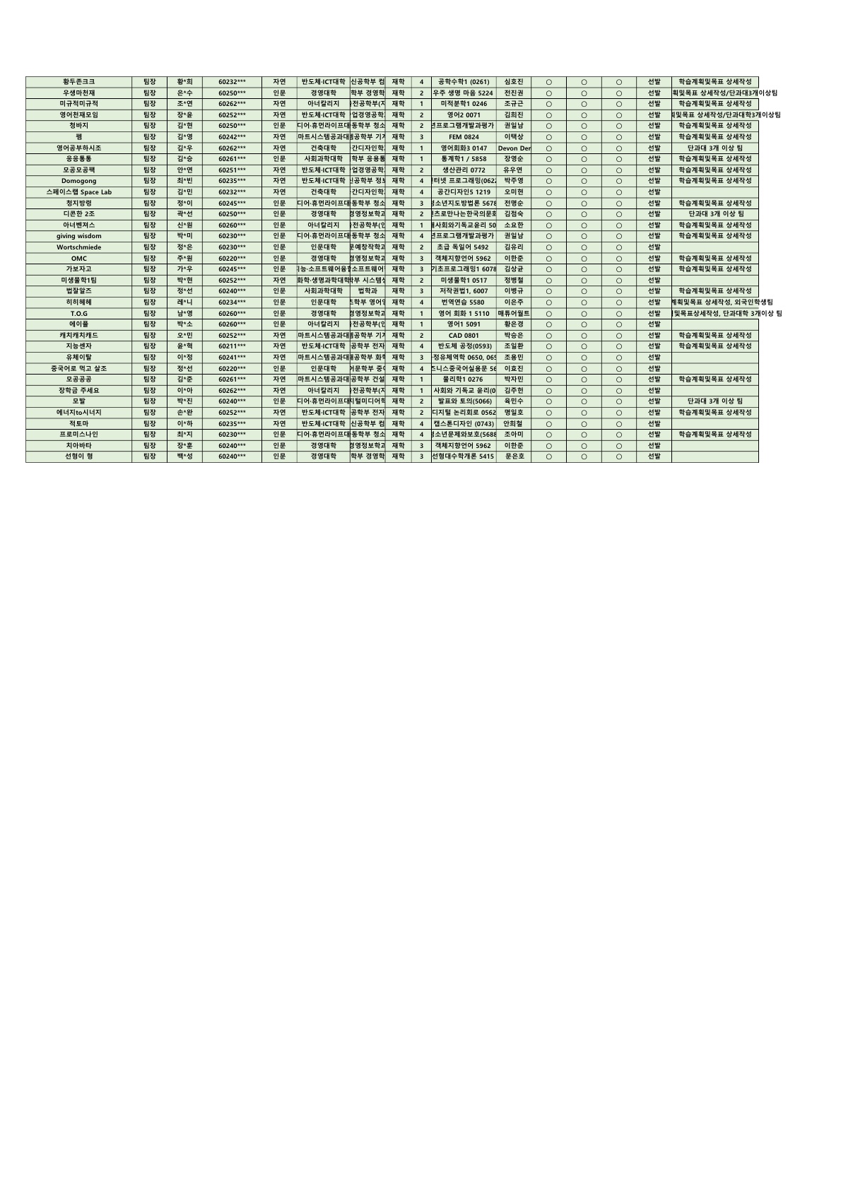 필수조건 1) 정규 등록(1~8학기, 건축 10학기) 학부 재학생 2) 모든 신청서류 정상 제출(서명 이미지, 중요 개인 정보 오류 없음, 필수 항목 체크, 지도교수 서명, 장학금 지급 계좌 입력 등) 3) 팀원 전체 동일강좌 수강여부 ※ 해당 학기 동일 과목 인정 기준 : 동일교수, 동일교육과정 (강의 시간만 다른 경우 가능) 4) 장애 학생, 외국인 학생 포함 팀 정원외 추가 선발할 수 있음 : 소수 학생 포함 여부 확인을 위해 신청서 ‘팀 구성원’ 에 명시 필수 추가 선발 조건 1) 신청자가 많은 관계로 단과대학별로 팀 배분 2) 신청서 내용 정성도 평가(학습 내용 및 방법 상세 기재) 3) 팀별 단과대학 3개 이상 구성된 팀 |