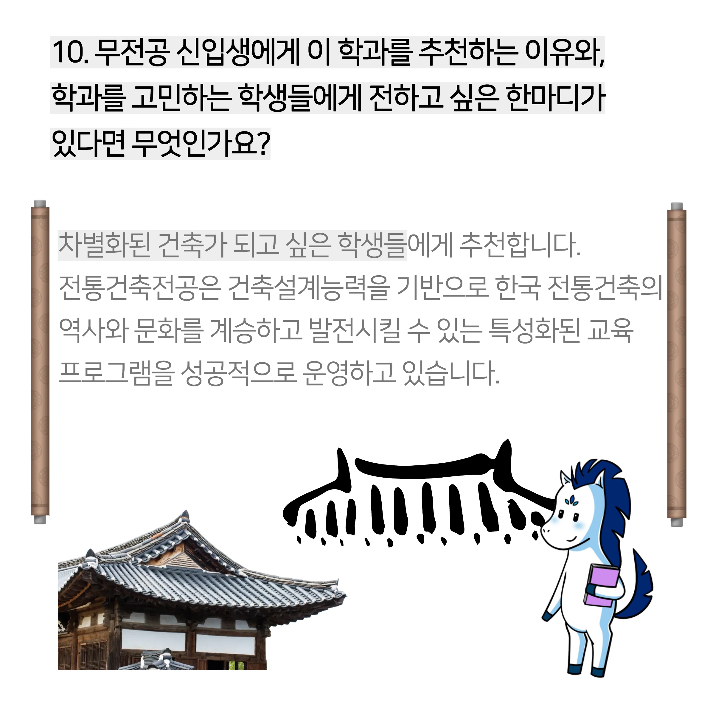 전통건축학과는 타 건축학과와 달리 역사와 문화를 계승하기 때문에 특성화된 건축전문가를 양성할 수 있다는 장점이 있죠~