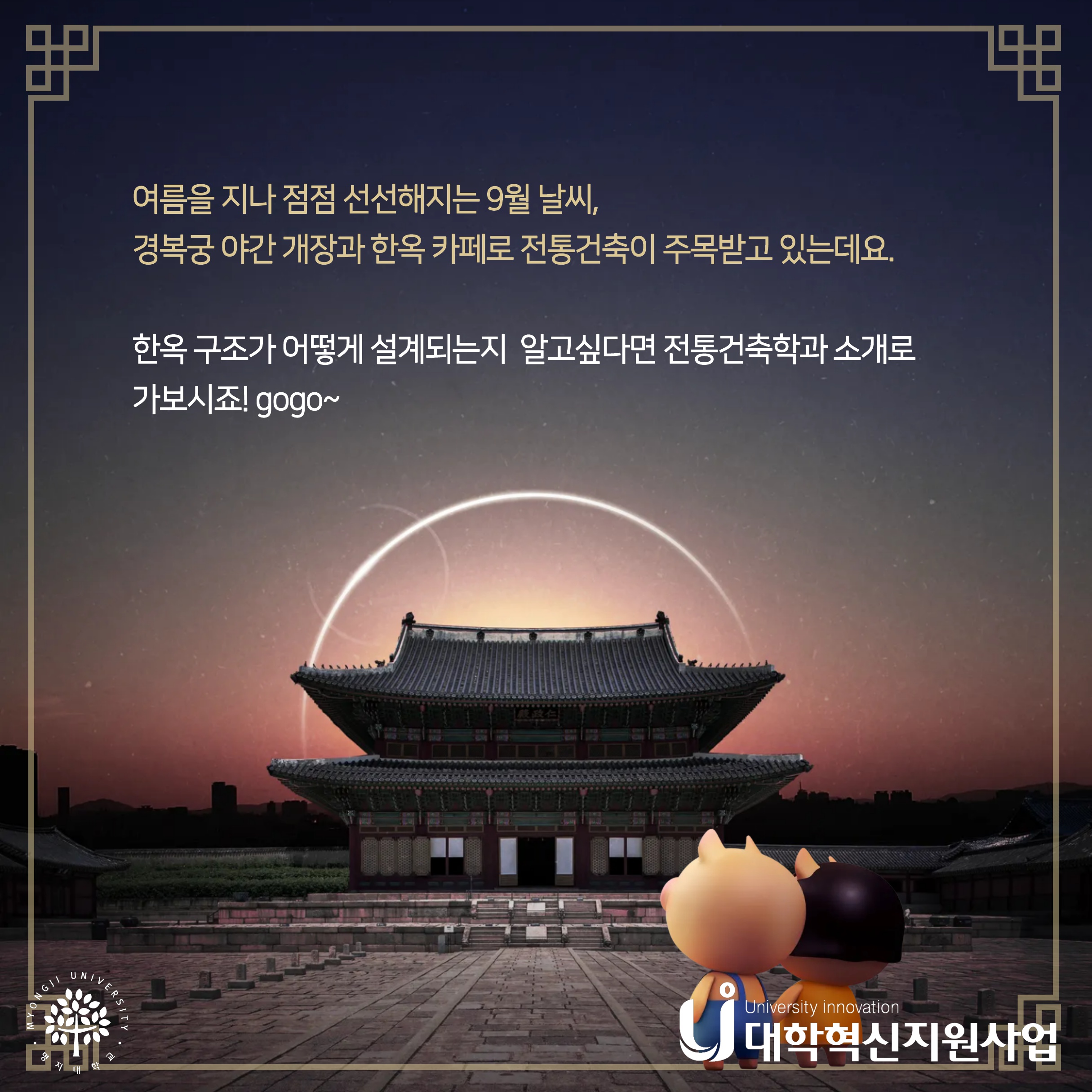 안녕하세요! 요즘 경복궁 야간개장이 눈길을 끌고 있는데요. 그만큼 한옥에 관심이 많아지면서 전통건축학과가 유망받고 있습니다!