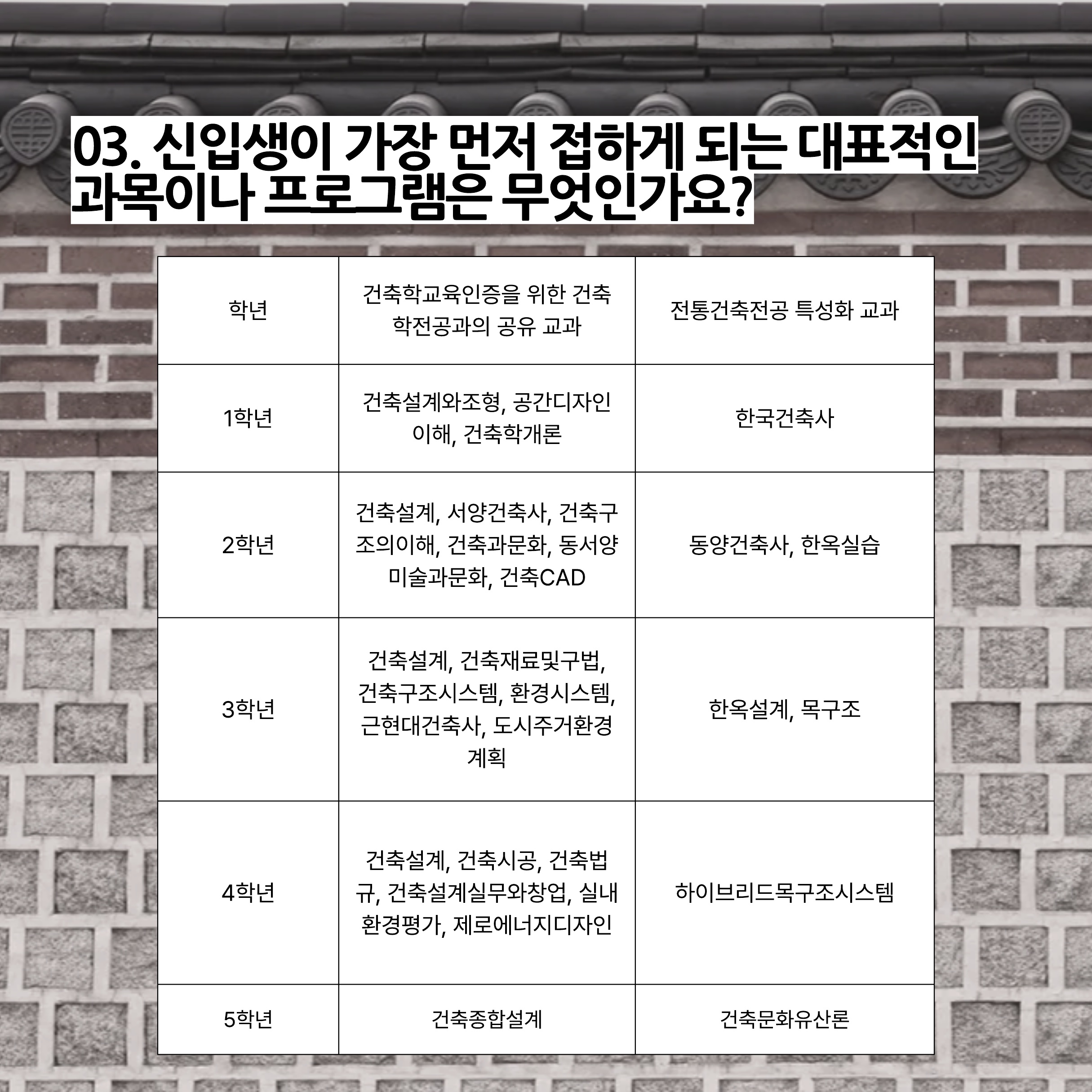 전통건축학은 총 5년제로, 신입생들이 먼저 접하게 되는 교과목은 건축학개론, 건축설계와 조형, 공간 디자인 이해와 특성화 교과로는 한국건축사를 배워요.