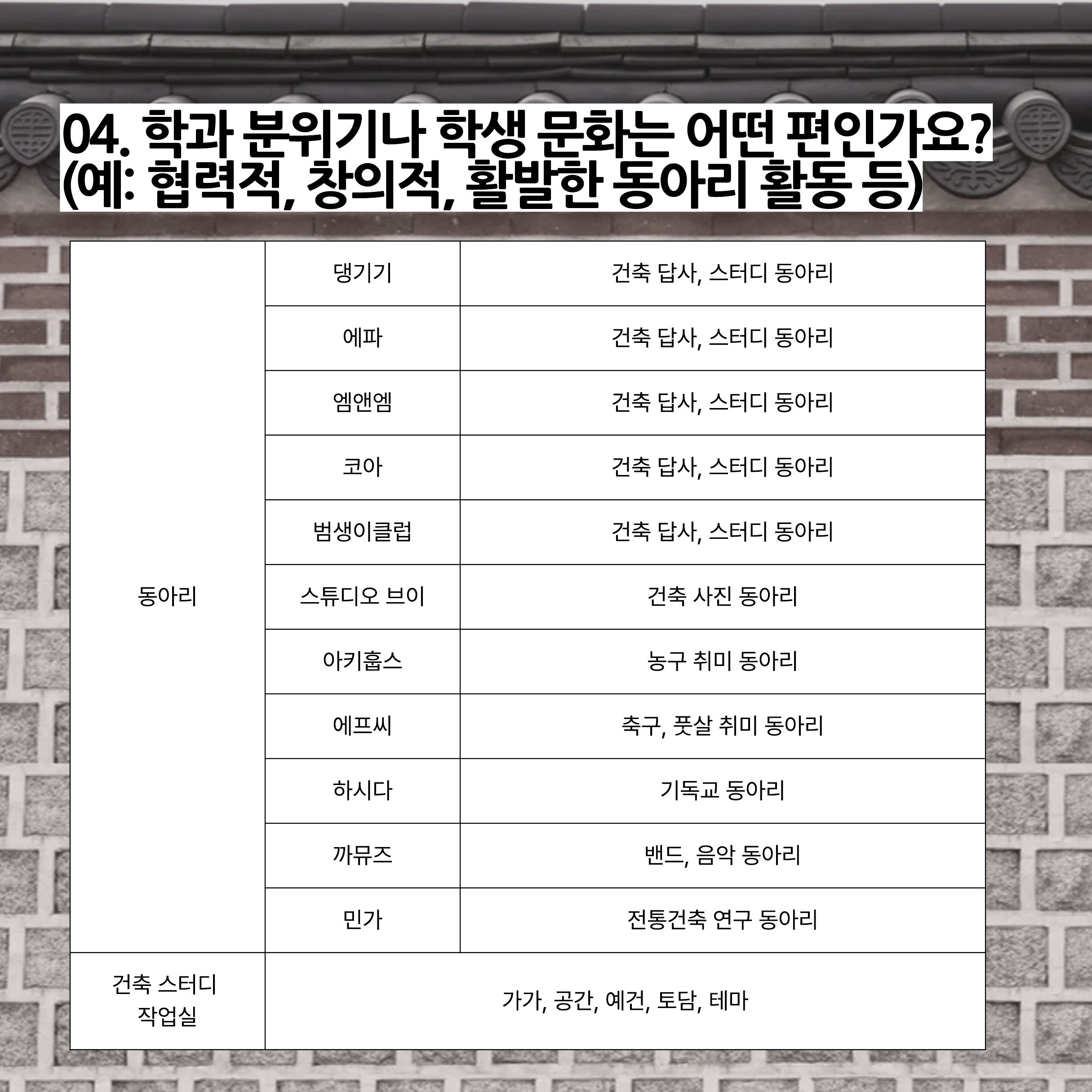 대학교내 중앙동아리도 있지만, 학과 안에서도 동아리가 존재하는데요, 이를 학회라고 해요. 전통건축학 학회는 건축 답사, 스터디, 운동 등이 주를 이루네요. 딱딱한 이론만 배우는 것이 아니라 학과 내 친목적인 분위기가 형성됩니다.