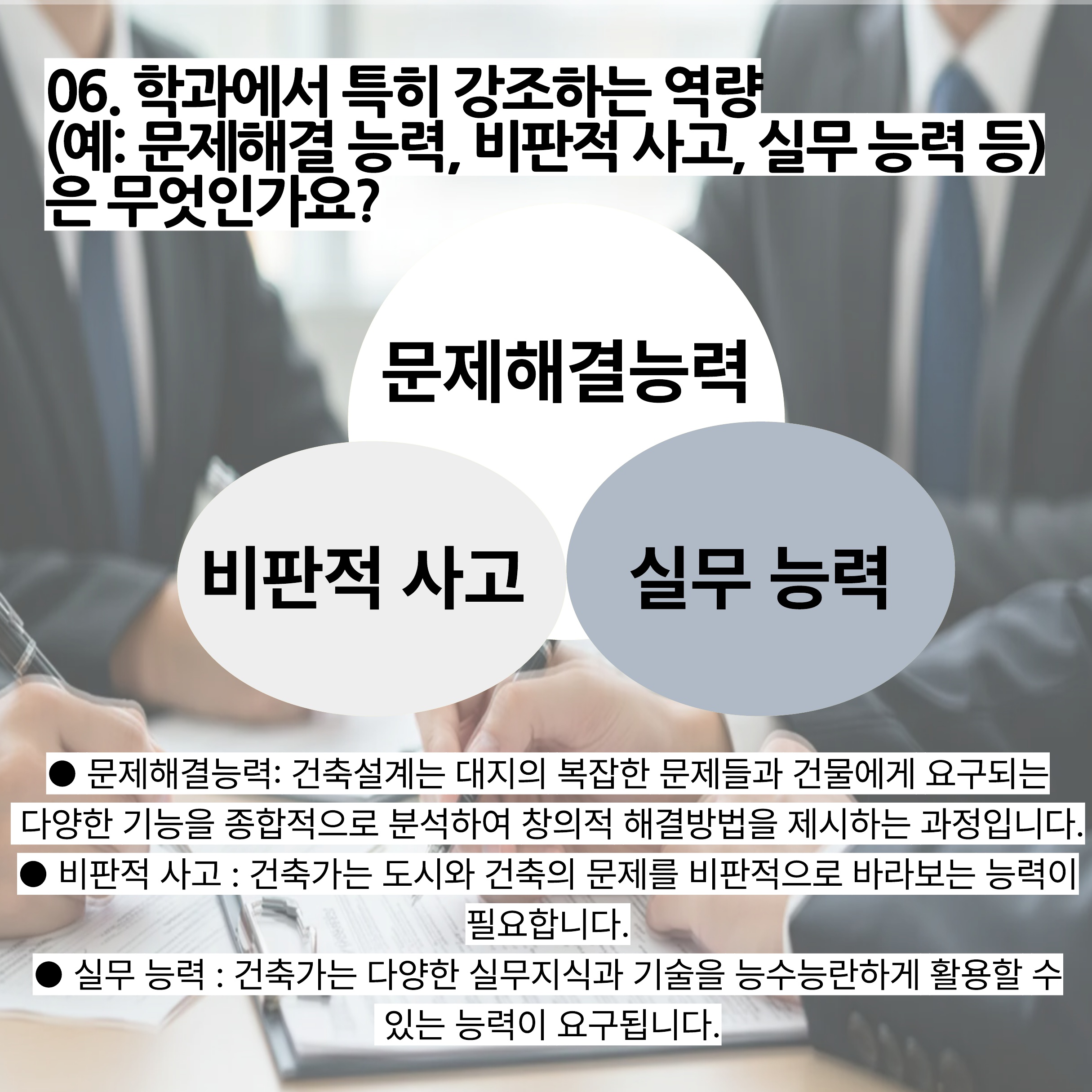 전통건축학과는 건축 실습을 하다보니 문제해결능력, 비판적사고, 실무능력의 역량을 가진 학생들을 선호해요.