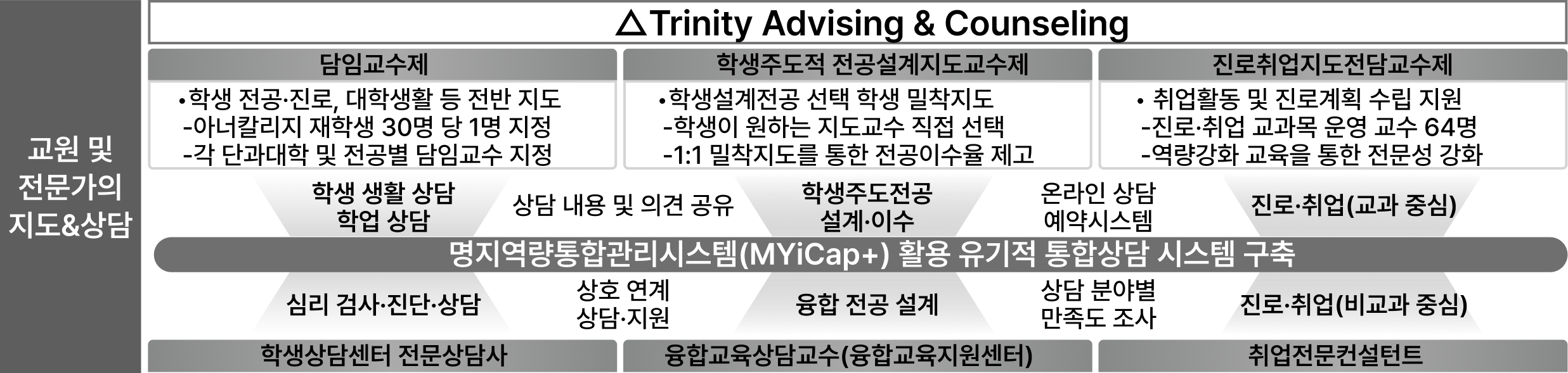 명지대학교의 학생지원 통합관리체계로 학생 지도 및 진로·전공 상담 지원 제도입니다.운영체계
