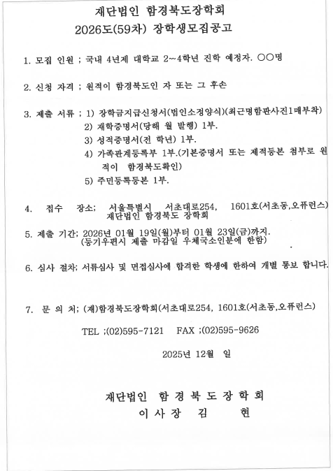 fnctId=bbs,fnctNo=145 재단법인 함경북도장학회 2026도(59차) 장학생 모집 안내 작성일2025.12.29 수정일2025.12.29 작성자 김*린 조회수63 첨부파일 장학금 신청서.pdf