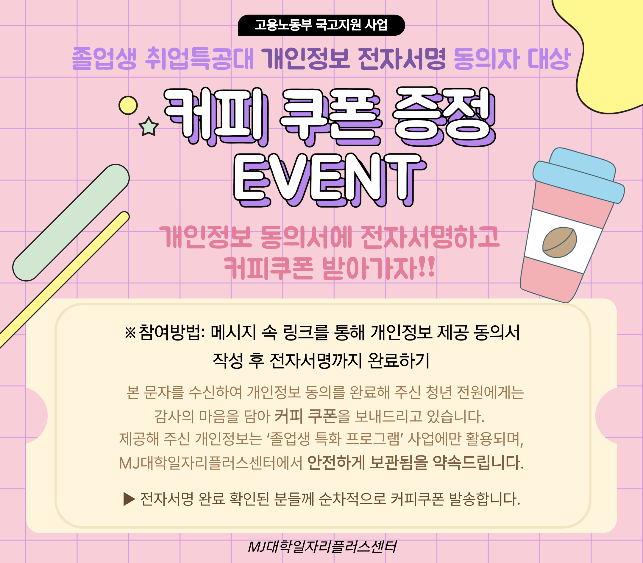 [MJ대학일자리플러스센터] 졸업생취업특공대 개인정보동의 청년 대상 커피쿠폰증정 이벤트 안내