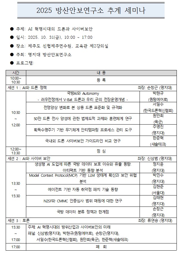 fnctId=bbs,fnctNo=1251 2025 방산안보연구소 추계 학술대회 개최 안내 작성일2025.09.26 수정일2025.10.09 작성자 관*자 조회수68 우리 연구소는 추계 학술대회를 다음과 같이 개최합니다. 첨부파일 첨부파일이(가) 없습니다.