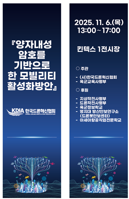 fnctId=bbs,fnctNo=1251 [드론봇안보센터] 양자내성 암호를 기반으로한 모빌리티 활성화 세미나 작성일2025.11.03 수정일2025.11.03 작성자 관*자 조회수10 드론봇안보센터는 "양자내성 암호를 기반으로한 모빌리티 활성화 세미나" 행사를 후원합니다. 첨부파일 첨부파일이(가) 없습니다.