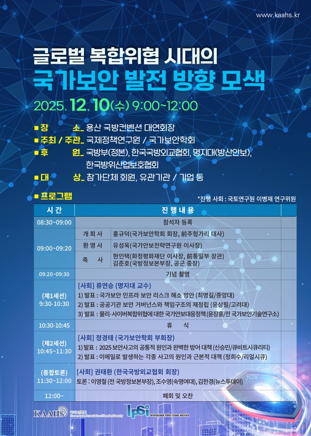 fnctId=bbs,fnctNo=1251 연구소 후원 "국가보안 발전 방향 모색" 세미나 안내 작성일2025.12.02 수정일2025.12.02 작성자 관*자 조회수17 국가보안학회 주관 학술세미나에 우리 연구소가 후원기관으로 참여합니다. 첨부파일 첨부파일이(가) 없습니다.