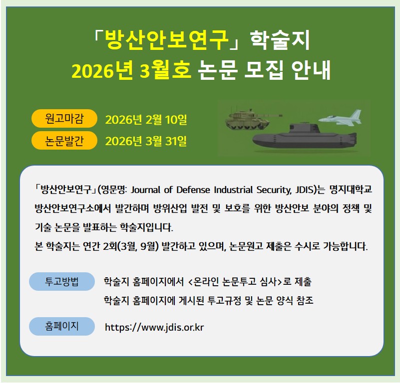 fnctId=bbs,fnctNo=1251 <방산안보연구> 논문 모집 안내 (2026년 3월호) 작성일2026.01.02 수정일2026.01.02 작성자 관*자 조회수28 <방산안보연구> 2026년 3월호 논문을 모집하고 있습니다. 아래를 참고하여 투고 바랍니다. 첨부파일 첨부파일이(가) 없습니다.