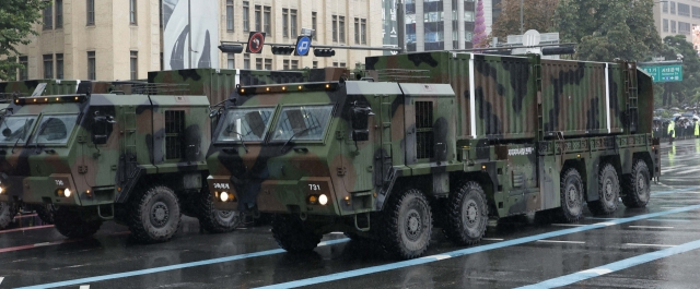 건군 75주년 국군의 날 기념행사가 열린 지난 926일 오후 서울 중구 세종대로에서 국군 장병들이 시가행진하고 있다. 사진은 고위력 탄도미사일 ‘현무’로 탄두 중량만 8~9톤, 총중량은 36톤에 달하는 ‘괴물 미사일’인 것으로 알려졌다. 연합뉴스